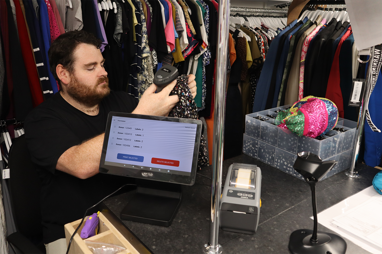 For gift aid donations simply count the number of donated items in the bag, scan the bag’s barcode, pick the number of labels, press print and stick the barcode labels on your price tags.